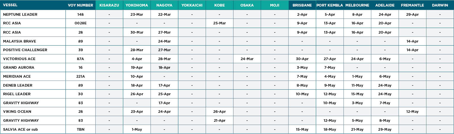 モアナ ブルーは、お客様の車両輸入計画に役立つように設計された、正確かつ最新のロールオンロールオフ (RORO) 配送を提供することを目指しています。詳細な出発時刻と到着時刻、船舶名、寄港地、重要な貨物の最新情報に即座にアクセスできます。